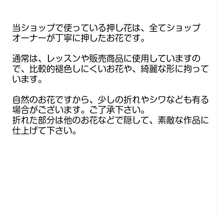 サイズお花のサイズ画像にてご確認下さい(自然素材のため、大きさにバラツキがある場合があります) 注意点 ・開封後は、乾燥剤とともに空気に触れない状態を保ち、出来るだけ早く使いきって下さい。