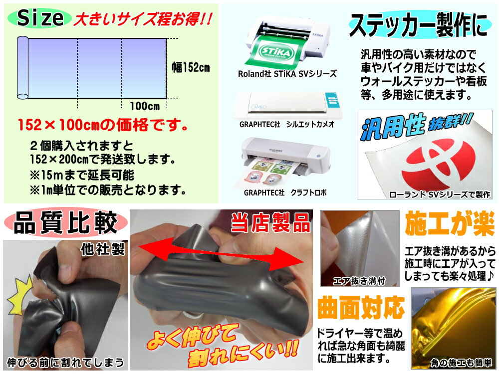 ※セダンのフルラッピングで約15m程度必要(あくまで参考です)ドアピラーやフロント/リアバンパーなど部分ラッピング、スペシャルなドレスアップ、フルラッピング是非チャレンジ!!【必読】※色/伸び/質感に関する質問が多々御座いますがモニター環境によって色味が異なって見えたり、思っていた色味と違う等の事態が無いよう、不安な方は購入前にサンプルセットをご購入下さい。