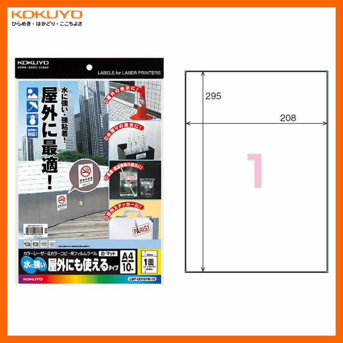 【A4・1面・10枚】KOKUYO/カラーレーザー&カラーコピー用フィルムラベル LBP-OD101W-10 白・マット 10枚 耐水性に優れた強粘着タイプ、水まわりや屋外に使用に最適 コクヨ ◆用紙種類が選択できる機種で「タックフィルム」または「厚紙」に設定し、印刷してください。