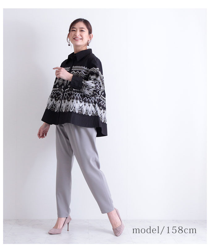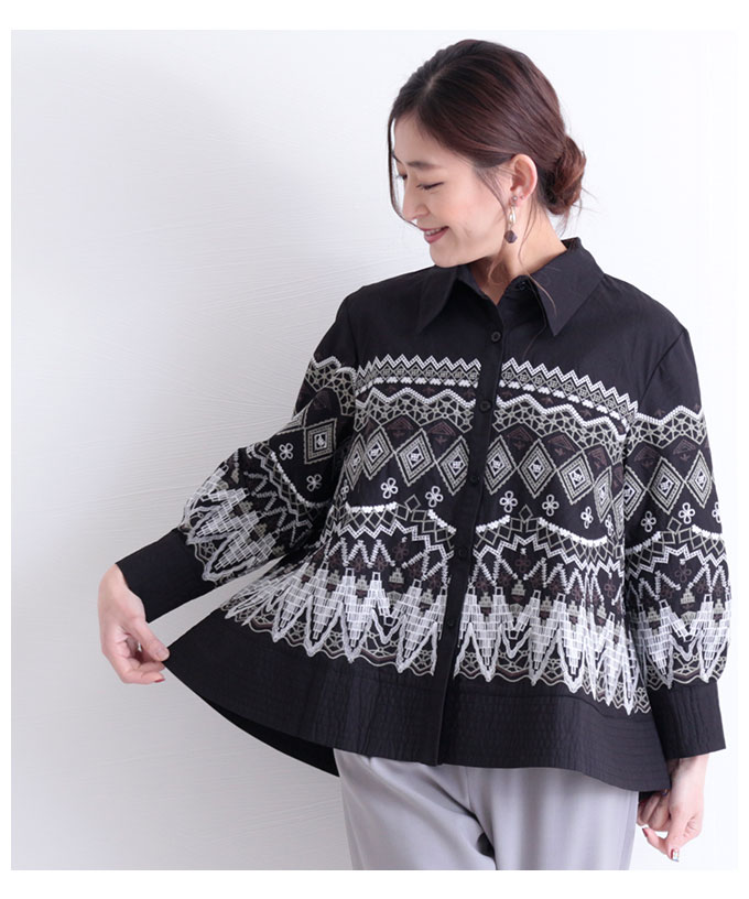 全体に施された刺繍がとても映えて大人かわいいシャツです。