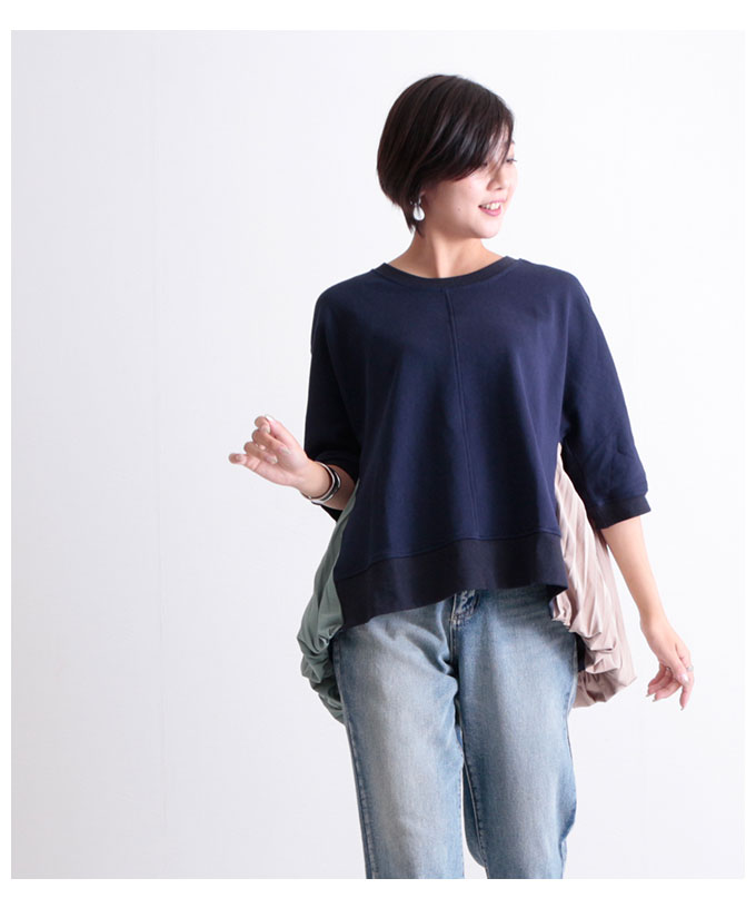 Aラインのシルエットと背面のプリーツが女性らしさを演出してくれる大人カジュアルに着こなせる2枚です。